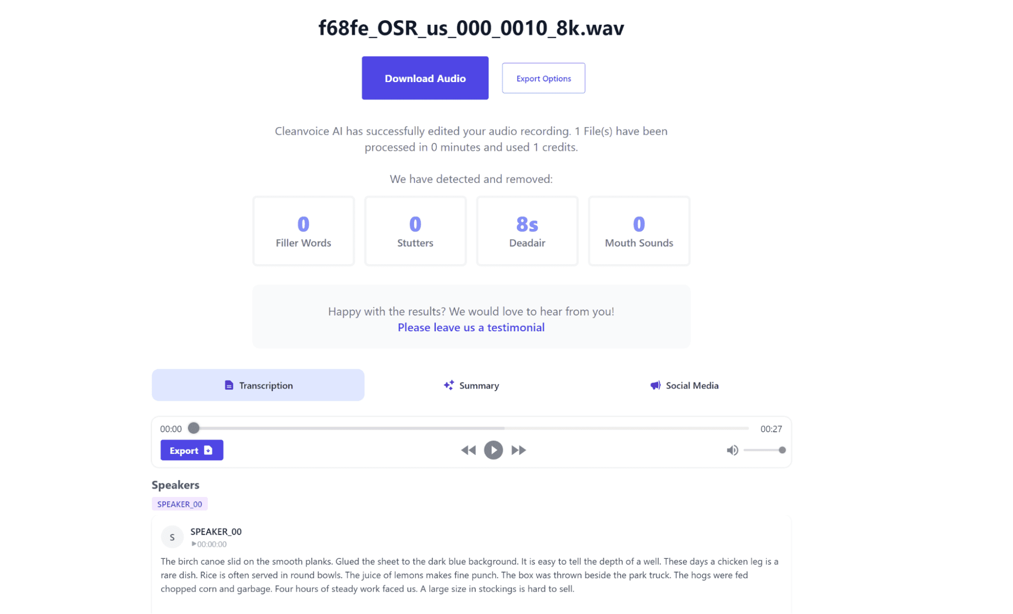 Take Cleanvoice, for example. Our AI transcription algorithm specifically detects and transcribes the spoken word in the podcast medium. It can generate accurate transcripts for full episodes in minutes. It also takes care of audio cleaning and automatically detects multiple speakers in your podcast.