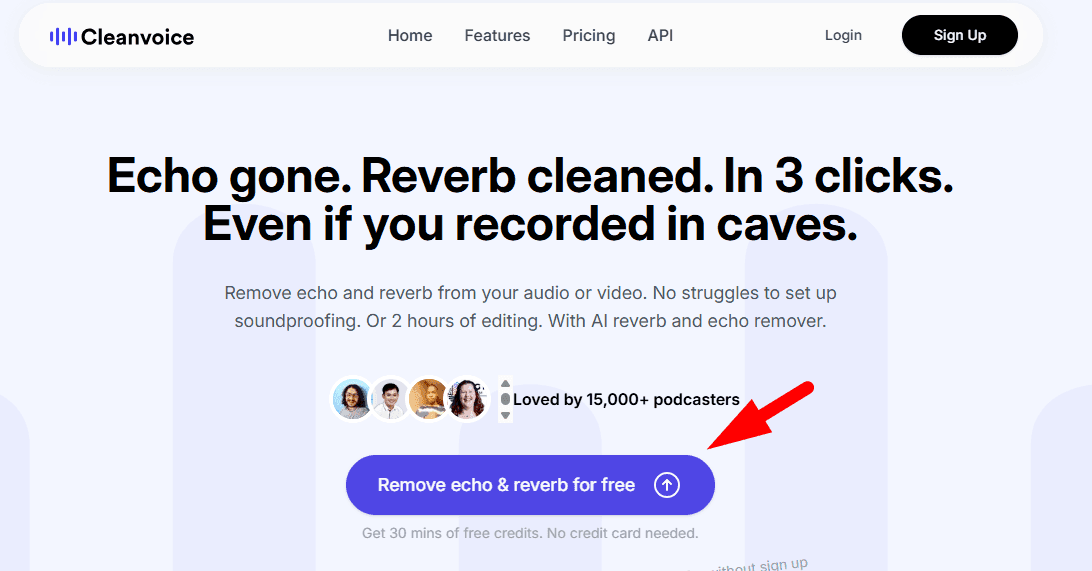 Visit the Cleanvoice Echo Reverb Removal Tool Page and click the “Remove echo & reverb for free” button.