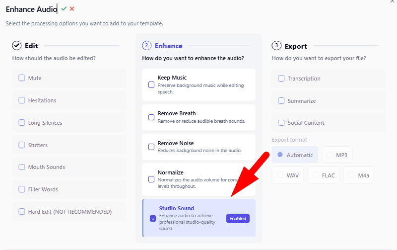 - Check only the box labeled “Studio Sound” under the "Enhance" section (This specifically targets echo and reverb, giving your audio a polished, studio-quality sound.)