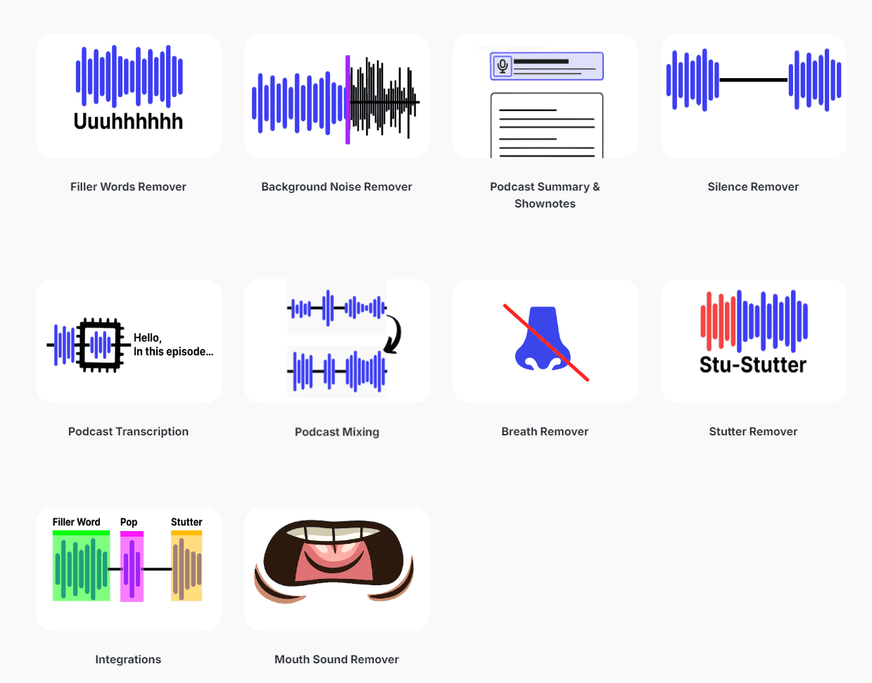 - Filler Word Detection & Removal: Automatically identifies and removes filler words, cleaning up speech in podcasts.