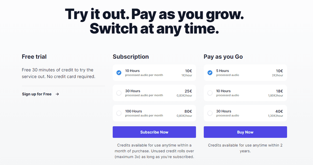 The Subscription plan starts at €10 for 10 hours per month, going up to €80 for 100 hours, with credits valid for two years and rolling over. The Pay-as-You-Go plan starts at €10 for 5 hours, with additional options for 10 (€18) and 30 (€40) hours. Plus, we also offer 30 minutes of free audio processing.